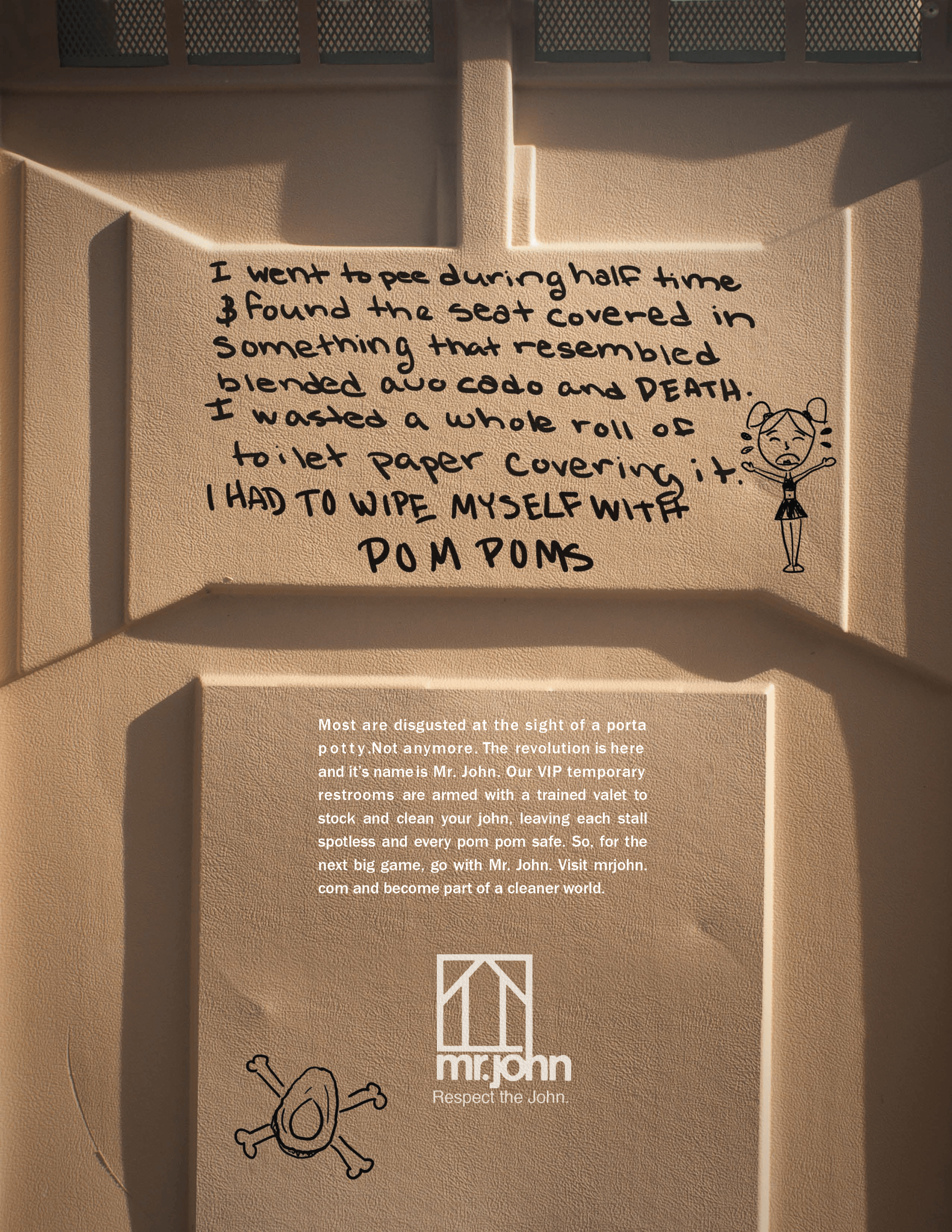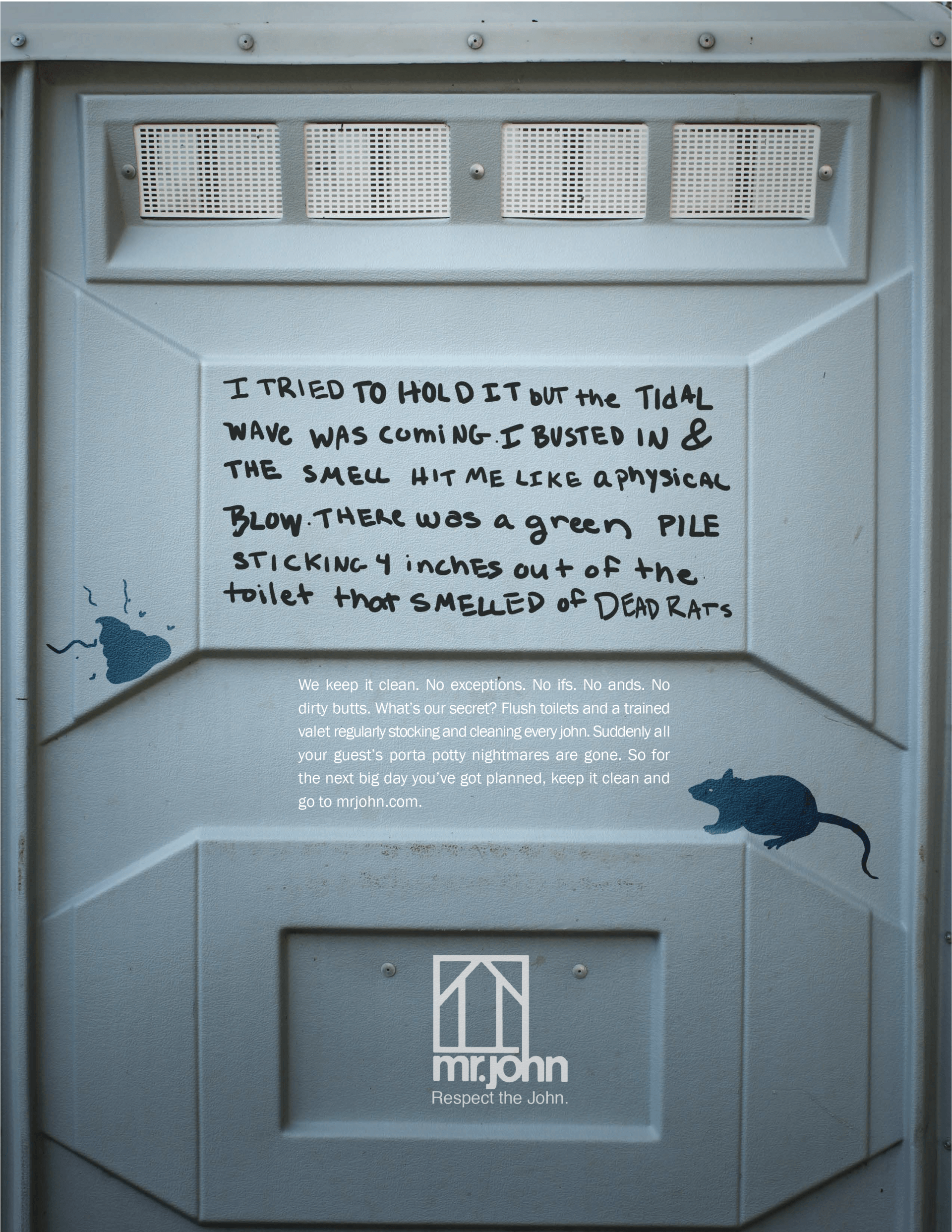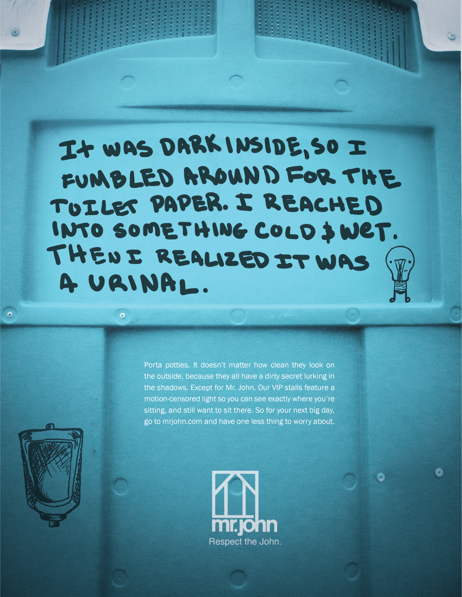 Mr. John is a portable sanitation rental service that stocks events with Porta-potties featuring upgraded luxury and VIP stalls and trailers. I created this print campaign for Mr. John tailored towards event planners to prove that Mr. John is not the enemy. I told these horror stories in the form of Porta-potty confessions to create the perfect combination of disgust and intrigue.