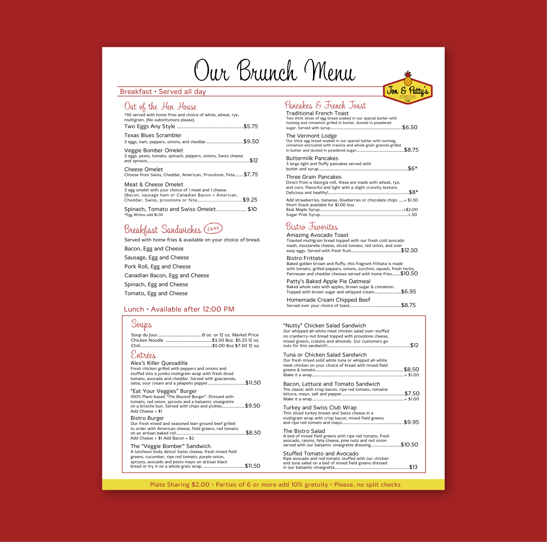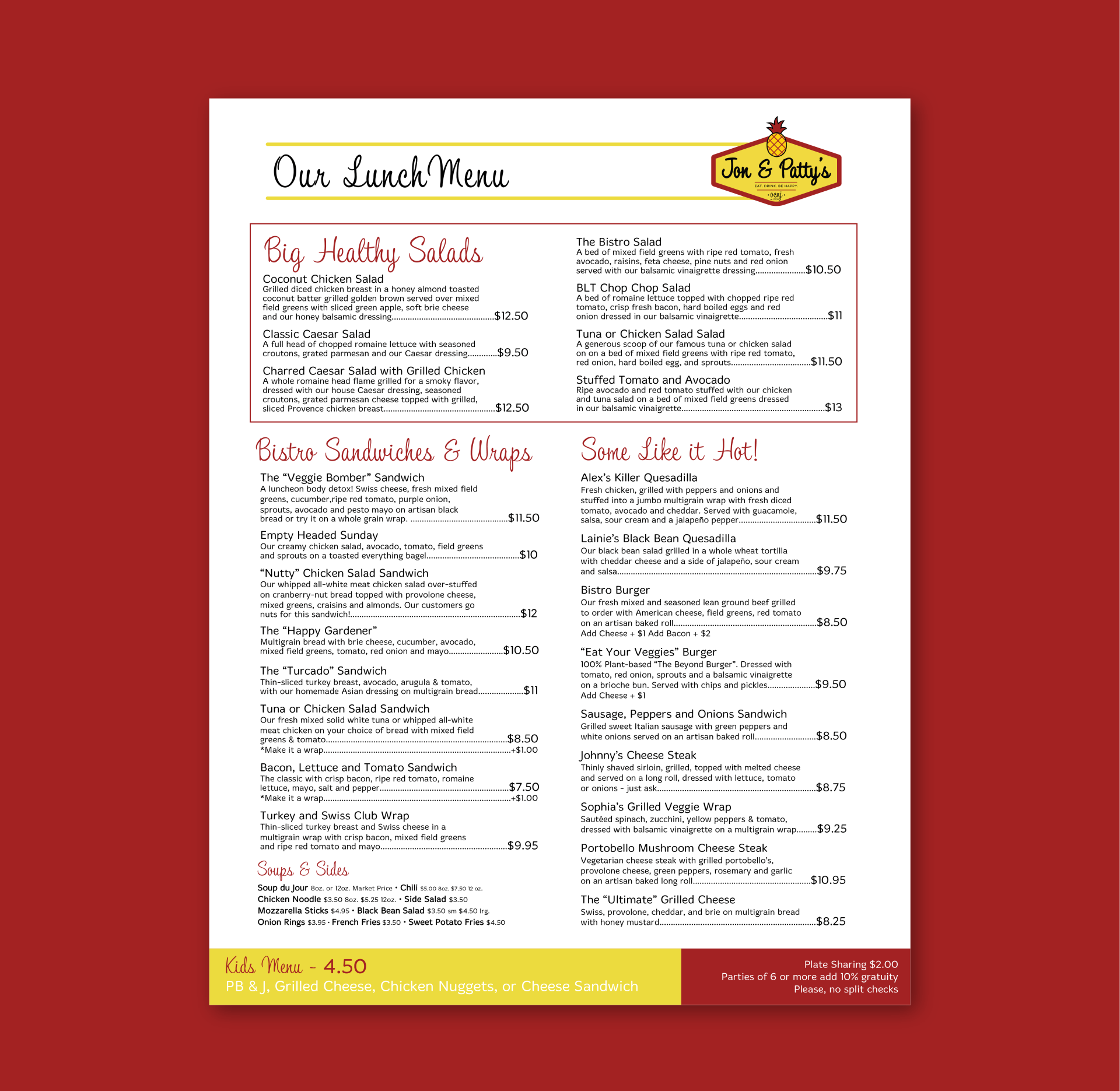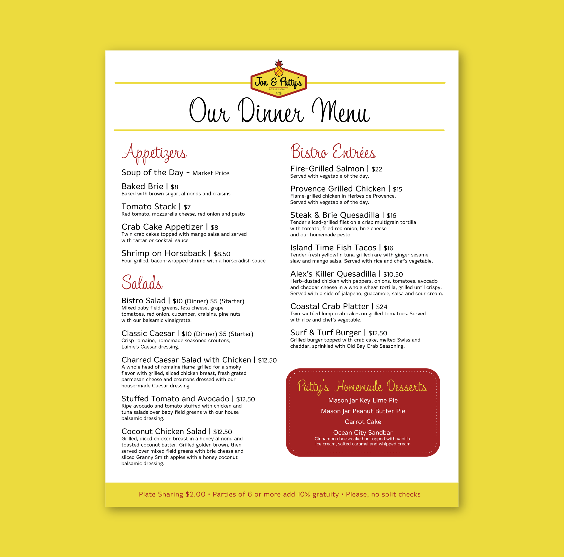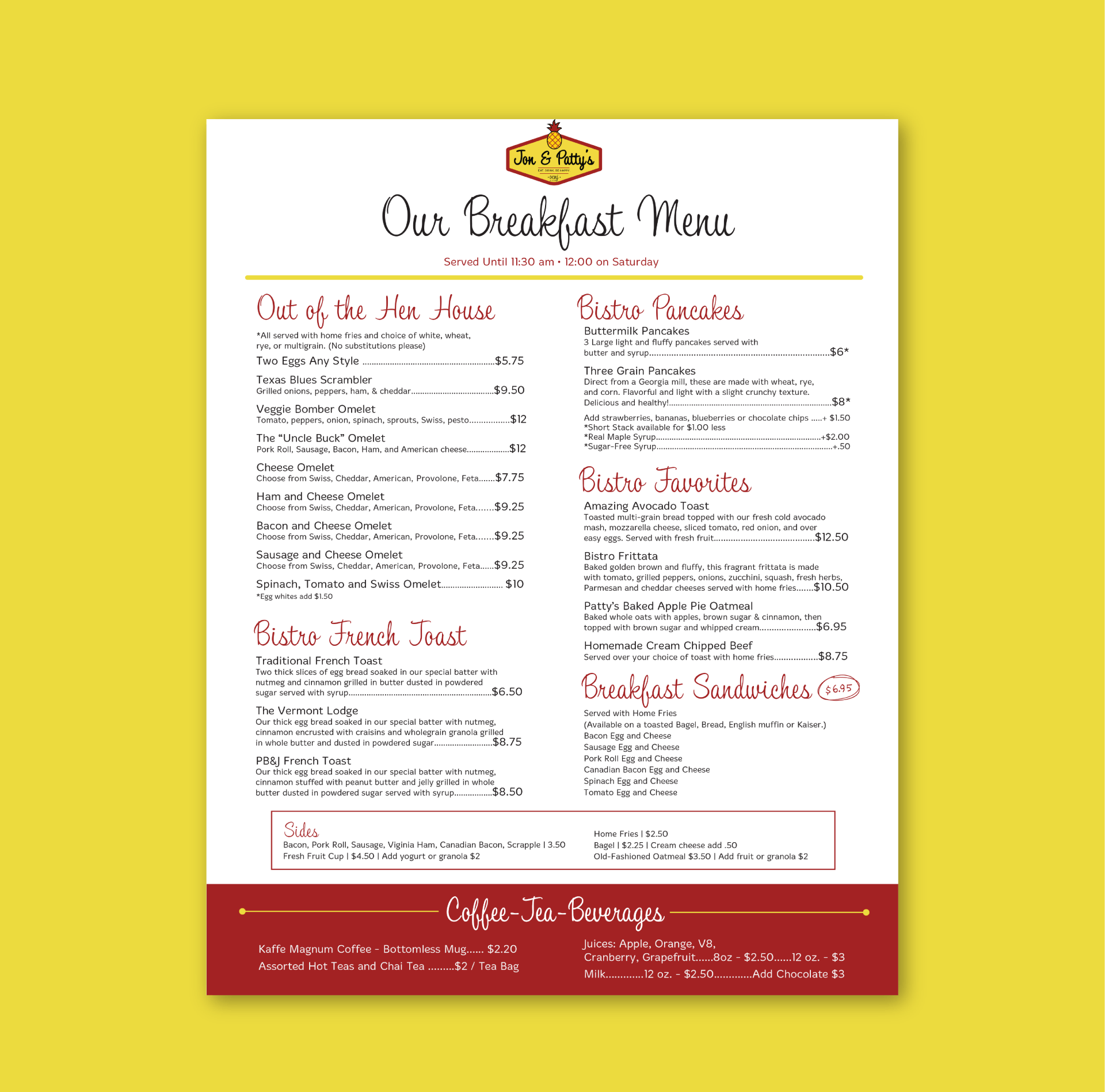 Jon & Patty’s Coffee Bar & Bistro is a restaurant located in Ocean City NJ that serves breakfast, lunch, brunch, and dinner. Their team values the balance between great food and a great dining experience, which is why they operate by the motto “Eat. Drink. Be Happy.” I was asked to create eye-catching yet concise menus for each of their dining sessions, as well as a menu for their coffee bar.